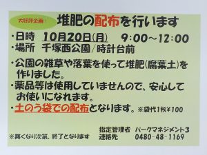 先月9/27(土)に実施した、『堆肥配布』は大盛況に終わりました。 まだ在庫もあることから、第二弾を開催します。 今回は平日開催となりますが、皆様お誘いあわせの上、 是非ご来園ください。